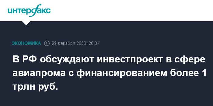 В РФ обсуждают инвестпроект в сфере авиапрома с финансированием более 1 трлн руб.