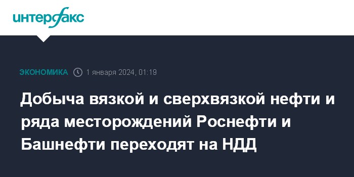 Москва. 1 января. INTERFAX.RU - Добыча вязкой и сверхвязкой нефти с 1 января 2024 года переводится на налогообложение дохода на добавленный доход (НДД).