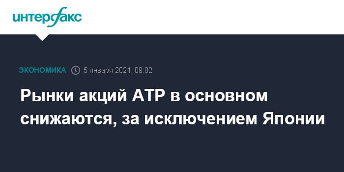 Москва. 5 января. INTERFAX.RU - Рынки акций крупнейших стран Азиатско-Тихоокеанского региона (АТР) снижаются в пятницу, за исключением Японии.
