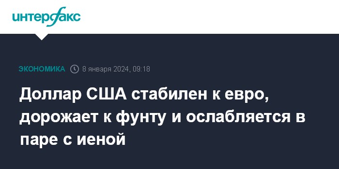Москва. 8 января. INTERFAX.RU - Доллар США стабилен в паре с евро на торгах в понедельник, укрепляется относительно фунта стерлингов и дешевеет к иене.