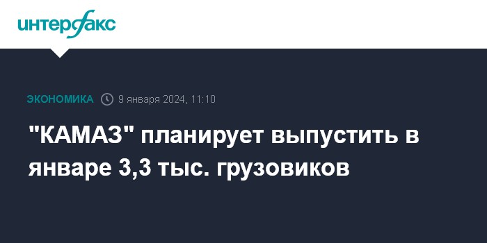 Москва. 9 января. INTERFAX.RU - ПАО "КАМАЗ" во вторник возобновило выпуск грузовиков после новогодних каникул и за оставшиеся дни января планирует выпустить более 3,3 тыс. машин, сообщила пресс-служба компании.