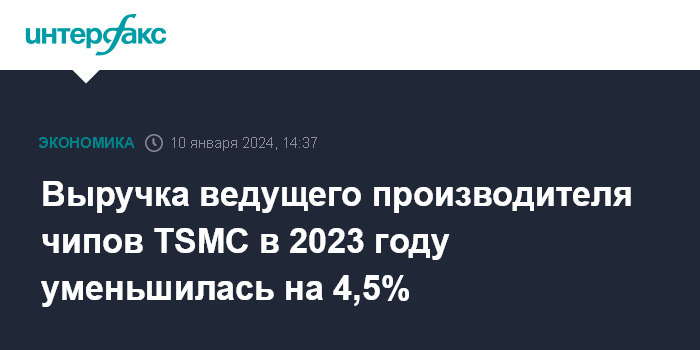 Москва. 10 января. INTERFAX.RU - Выручка ведущего мирового производителя микросхем на заказ Taiwan Semiconductor Manufacturing Co. (TSMC) в 2023 году снизилась на 4,5% по сравнению с предыдущим годом.