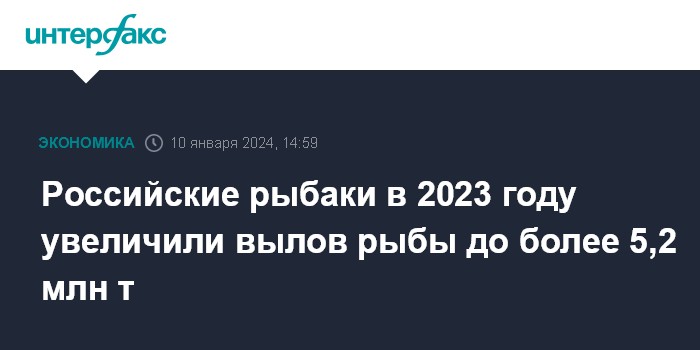 Москва. 10 января. INTERFAX.RU - Рыбаки РФ в 2023 году увеличили вылов рыбы до более 5,2 млн тонн с 4,9 млн тонн в 2022 году.