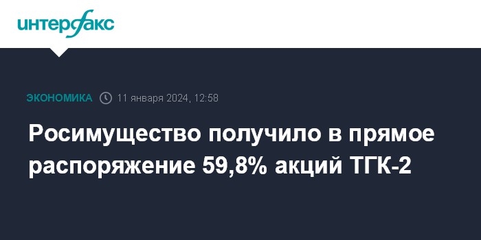 Москва. 11 января. INTERFAX.RU - Росимущество получило в прямое распоряжение 59,8% акций ПАО "ТГК-2", говорится в раскрытии компании.