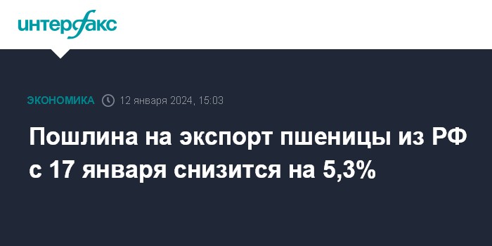 Москва. 12 января. INTERFAX.RU - Ставка пошлины на экспорт пшеницы из России с 17 января составит 3 946,5 рубля против 4 165,9 рубля за тонну неделей ранее, сообщает Минсельхоз.