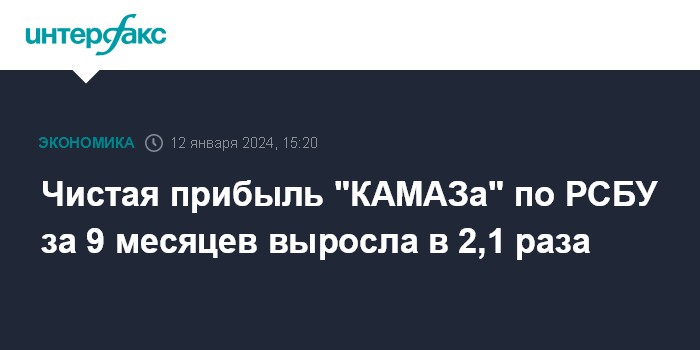 Москва. 12 января. INTERFAX.RU - Чистая прибыль ПАО "КАМАЗ" по РСБУ за январь-сентябрь 2023 года подскочила в 2,1 раза, до 15,8 млрд рублей, сказано в отчетности компании.