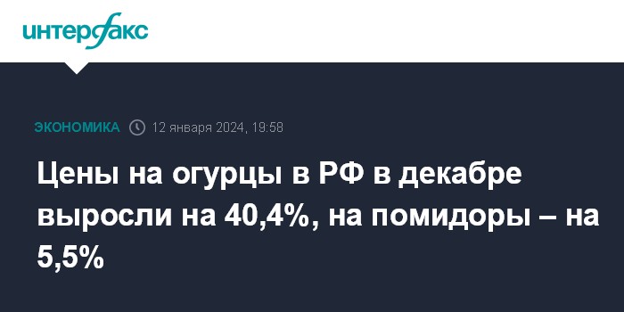 Москва. 12 января. INTERFAX.RU - Цены на огурцы в РФ в декабре 2023 года выросли на 40%, сообщил Росстат в пятницу.