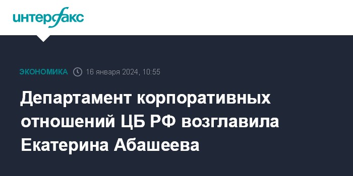 Москва. 16 января. INTERFAX.RU - Директором департамента корпоративных отношений Банка России с 16 января назначена Екатерина Абашеева, соответствующий приказ подписан председателем Банка России, говорится в пресс-релизе ЦБ РФ.