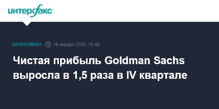 Москва. 16 января. INTERFAX.RU - Американский банк Goldman Sachs Group в четвертом квартале 2023 года нарастил чистую прибыль в полтора раза, выручку - на 7%, при этом оба показателя оказались заметно лучше ожиданий рынка.