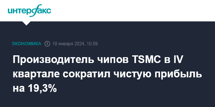 Москва. 18 января. INTERFAX.RU - Ведущий мировой производитель чипов на заказ Taiwan Semiconductor Manufacturing Company в четвертом квартале сократил чистую прибыль на 19,3%, при этом она превысила прогноз.