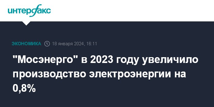 Москва. 18 января. INTERFAX.RU - ПАО "Мосэнерго" в 2023 г. увеличило производство электроэнергии на 0,8% по сравнению с 2022 г., до 63,02 млрд кВт.ч, сообщила компания.