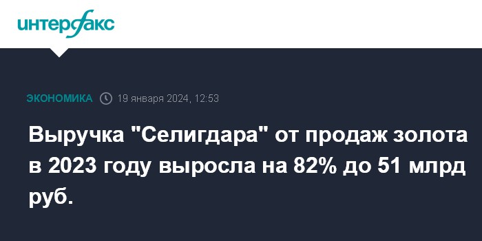 Москва. 19 января. INTERFAX.RU - Выручка от реализации золота холдингом "Селигдар" в 2023 году составила 50,8 млрд рублей, что выше уровня 2022 года на 82%, сообщила компания в пятницу.