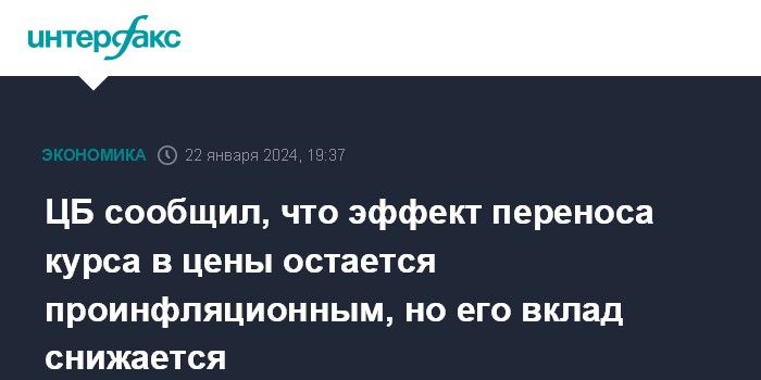 Москва. 22 января. INTERFAX.RU - Эффект переноса курсовой динамики в цены остается проинфляционным, но масштаб его влияния уменьшается, говорится в комментарии ЦБ РФ.