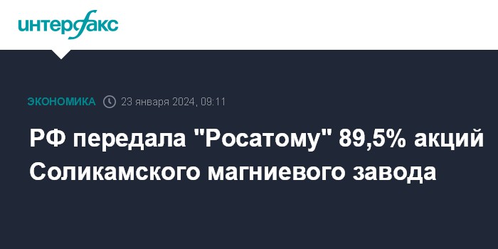 Москва. 23 января. INTERFAX.RU - Российская Федерация передала госкорпорации "Росатом" 89,5% акций ОАО "Соликамский магниевый завод" (СМЗ, Пермский край), говорится в сообщении СМЗ.