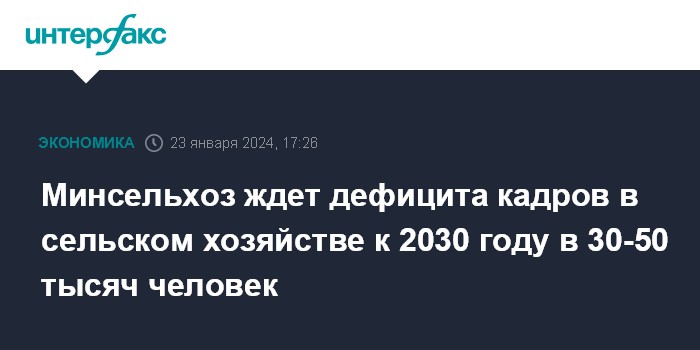 Москва. 23 января. INTERFAX.RU - Минимальная потребность в кадрах для российского агропромышленного комплекса к 2030 году может составить 30 тысяч человек, подсчитали в Минсельхозе.