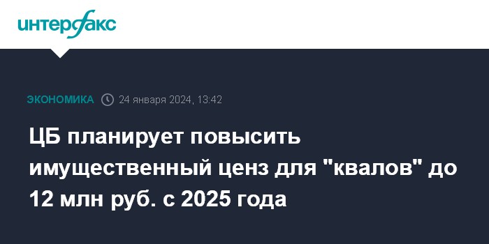 Москва. 24 января. INTERFAX.RU - Имущественный ценз для получения статуса квалифицированного инвестора с 1 января 2025 года будет повышен с нынешних 6 млн рублей до 12 млн рублей, с 1 января 2026 года – до 24 млн рублей, говорится в проекте указания Банка России.