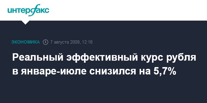 Москва. 7 августа. INTERFAX.RU - Реальный эффективный курс рубля к корзине валют государств - основных торговых партнеров России в январе-июле 2009 года снизился на 5,7% по отношению к декабрю 2008 года. Такие предварительные оценки производных показателей динамики обменного курса приведены в информации ЦБ РФ, размещенной на сайте банка в Интернете.
