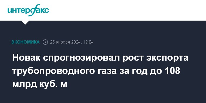 Москва. 25 января. INTERFAX.RU - Экспорт российского трубопроводного газа (суммарно в ближнее и дальнее зарубежье) в 2024 году вырастет до 108 млрд куб. м с 91,4 млрд куб. м в 2023 году, сообщил в авторской колонке журнала "Энергетическая политика" заместитель председателя правительства Александр Новак.