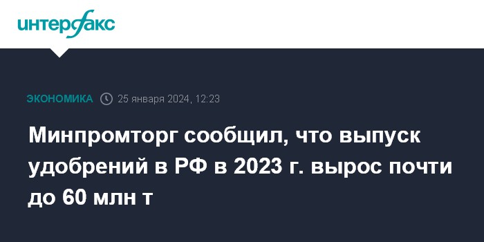 Москва. 25 января. INTERFAX.RU - Россия в 2023 году, по предварительным данным, увеличила производство минеральных удобрений на 9%, почти до 60 млн тонн (в физическом весе), заявил замминистра промышленности и торговли Михаил Юрин в ходе выставки "Россия" на ВДНХ.