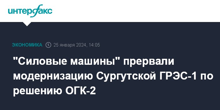 В "Силовых машинах" сообщили, что в декабре 2023 года получили от "ОГК-2" уведомление о необходимости приостановки обязательств по договору поставки оборудования для энергоблоков №2 и №12 Сургутской ГРЭС-1.