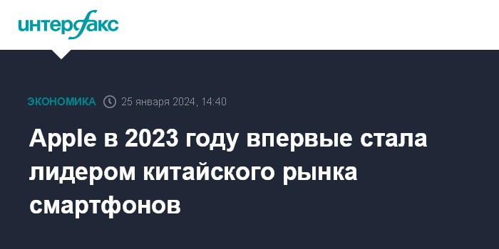 Москва. 25 января. INTERFAX.RU - Американская Apple Inc. впервые стала лидером китайского рынка смартфонов, увеличив свою долю в 2023 году до рекордных 17,3% с 16,8% годом ранее.