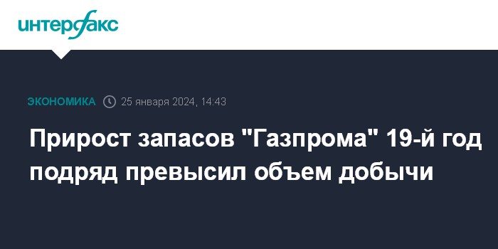 Москва. 25 января. INTERFAX.RU - Прирост запасов "Газпрома" в 2023 году снова превысил объем добычи, коэффициент восполнения запасов уже 19-й год подряд выше единицы, отмечает компания.
