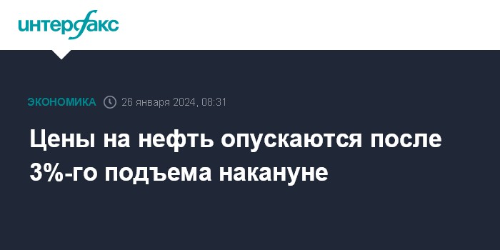 Москва. 26 января. INTERFAX.RU - Цены на нефть опускаются в пятницу, корректируясь после 3%-го подъема по итогам предыдущей сессии, и завершают неделю максимальным ростом с октября.