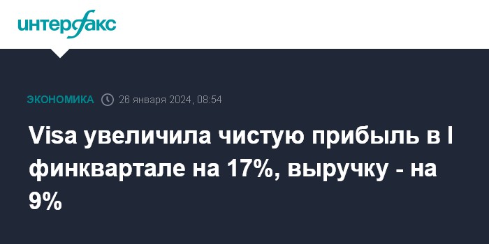Москва. 26 января. INTERFAX.RU - Американская Visa Inc., оператор крупнейшей в США платежной системы, увеличила чистую прибыль в первом квартале 2024 финансового года на 17%, выручку - на 9%.