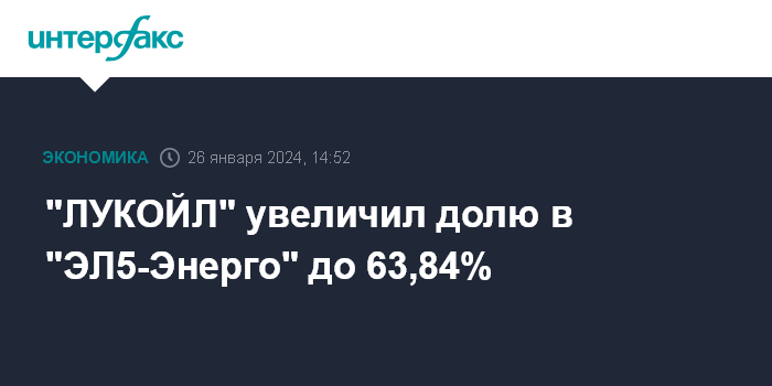 Москва. 26 января. INTERFAX.RU - ПАО "ЛУКОЙЛ" увеличило долю в ПАО "ЭЛ5-Энерго" до 63,84%, соответствующее изменение отобразилось на сайте энергокомпании. Ранее НК принадлежало 56,44% акций "ЭЛ5-Энерго".