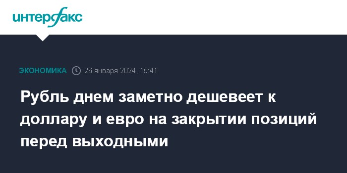 Как отмечают эксперты "Интерфакс-ЦЭА", рубль днем заметно дешевеет к основным мировым валютам на фоне негативной динамики цен на нефть и закрытии позиций перед выходными днями. В предыдущие дни рубль укреплялся благодаря подготовке компаний-экспортеров к первому в этом году единому дню уплаты налогов, который приходится на следующий понедельник, 29 января. Кроме того, поддержку рублю оказывали обязательная продажа валюты экспортерами и продажа ЦБ РФ валюты в рамках бюджетного правила.