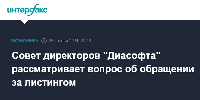 Москва. 26 января. INTERFAX.RU - Совет директоров ПАО "Диасофт" 26 января рассматривает вопрос об обращении с заявлением о листинге обыкновенных акций, сообщила компания.