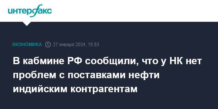 Москва. 27 января. INTERFAX.RU - Российские компании не испытывают проблем в части поставок нефти индийским контрагентам, заявил вице-премьер РФ Александр Новак журналистам.