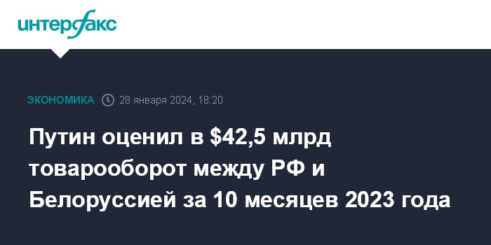 Путин оценил в $42,5 млрд товарооборот между РФ и Белоруссией за 10 месяцев 2023 года