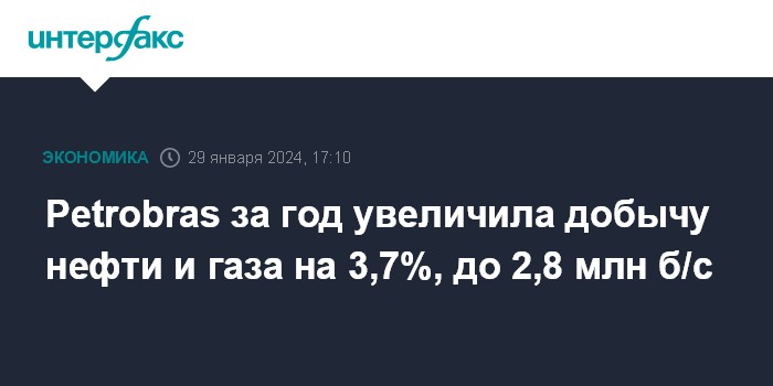 Москва. 29 января. INTERFAX.RU - Добыча углеводородов бразильской государственной нефтегазовой Petroleo Brasileiro S. A. (Petrobras) по итогам 2023 года составила 2,78 млн баррелей нефтяного эквивалента в сутки, что на 3,7% выше показателя 2022 года, сообщает компания. Добыча нефти составила 2,24 млн б/с.