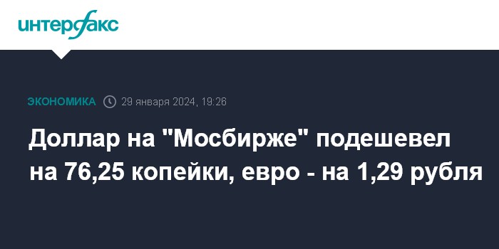 На основе данных "Московской биржи" о средневзвешенных курсах доллара и евро к рублю по сделкам, заключенным с 10:00 до 15:30 , Банк России поднял официальный курс доллара на 30 января на 9,31 копейки, до 89,609 рубля, и уменьшил курс евро на 11,68 копейки, до 96,9777 рубля.