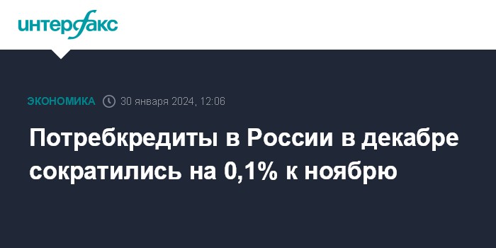 Москва. 30 января. INTERFAX.RU - Потребительское кредитование в декабре сократилось на 0,1% с корректировкой на крупную сделку по продаже кредитов в размере около 250 млрд рублей, говорится в обзоре ЦБ о динамике развития банковского сектора.