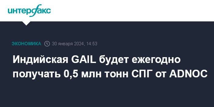 Москва. 30 января. INTERFAX.RU - Индийская газовая компания GAIL и ADNOC Gas (ОАЭ) подписали долгосрочное соглашение о поставках в Индию примерно 0,5 млн тонн СПГ в год. Документ рассчитан на 10 лет, поставки по нему начнутся в 2026 году.