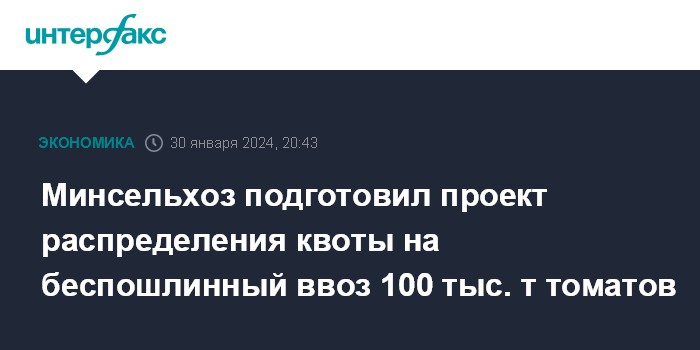 Москва. 30 января. INTERFAX.RU - Минсельхоз РФ подготовил проект постановления правительства, в котором в том числе содержатся правила распределения беспошлинной квоты на ввоз в РФ 100 тыс. тонн томатов до конца мая 2024 года.