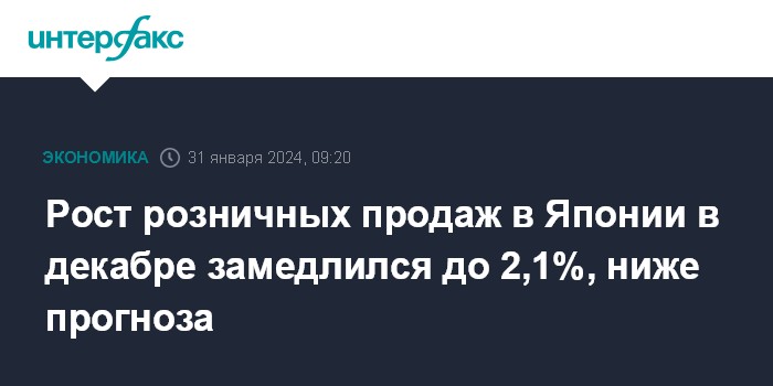 Москва. 31 января. INTERFAX.RU - Розничные продажи в Японии в декабре увеличились на 2,1% в годовом выражении. Об этом говорится в отчете министерства экономики, торговли и промышленности страны.