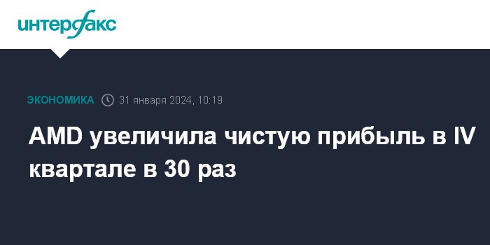 Москва. 31 января. INTERFAX.RU - Американский производитель микрочипов Advanced Micro Devices увеличил чистую прибыль в четвертом квартале 2023 года более чем в 30 раз, выручку – на 10%.
