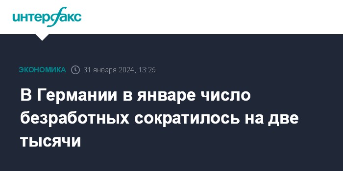Москва. 31 января. INTERFAX.RU - Количество безработных в Германии в январе неожиданно уменьшилось на 2 тысячи - до 2,694 млн, безработица составила 5,8%, сообщило Федеральное агентство по трудоустройству ФРГ.