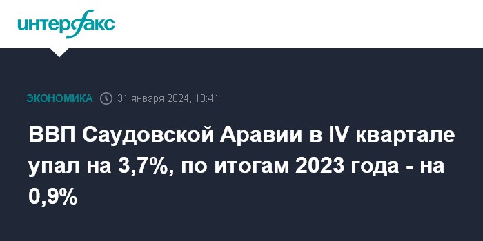 Москва. 31 января. INTERFAX.RU - ВВП Саудовской Аравии в четвертом квартале 2023 года уменьшился на 3,7% по сравнению с тем же периодом годом ранее, говорится в предварительном отчете статуправления страны.