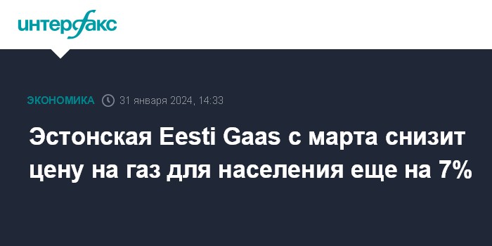 Москва. 31 января. INTERFAX.RU - Eesti Gaas, управляющая газораспределительной сетью Эстонии, с марта 2024 года планирует снизить цену на газ в рамках гибкого пакета для домашних потребителей на 7% - до 0,46 евро за кубометр (с учетом налога с оборота), сообщила пресс-служба компании.