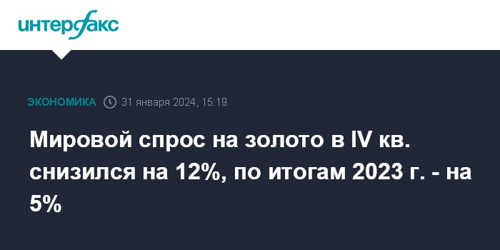 Мировой спрос на золото в IV кв. снизился на 12%, по итогам 2023 г. - на 5%