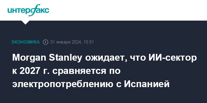 Москва. 31 января. INTERFAX.RU - Сектор экономики, связанный с генеративным искусственным интеллектом, к 2027 году будет потреблять столько же электричества, сколько использовала вся Испания в 2022 году, прогнозируют аналитики Morgan Stanley.