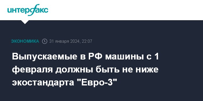 Москва. 31 января. INTERFAX.RU - Упрощённые требования техрегламента в части оснащения автомобилей системами курсовой устойчивости (ESP) продолжат действовать в России до конца 2024 года, но с 1 февраля выпускаемые в стране машины должны соответствовать экостандарту не ниже "Евро-3", сообщила пресс-служба Минпромторга.