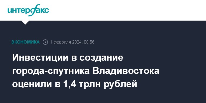 Москва. 1 февраля. INTERFAX.RU - Группа инвесторов готова принять участие в создании города-спутника Владивостока в формате государственно-частного партнерства (ГЧП), предполагающего инвестиции в объеме почти 1,4 трлн рублей, из которых 1 трлн рублей должны быть частными. Об этом сообщил гендиректор Корпорации развития Дальнего Востока и Арктики (КРДВ) Николай Запрягаев.