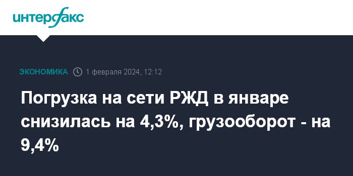 Москва. 1 февраля. INTERFAX.RU - В январе 2024 года погрузка на сети РЖД составила 94,8 млн тонн, что на 4,3% меньше, чем в январе 2023 года, сообщила компания.