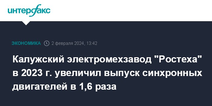 Калужский электромехзавод "Ростеха" в 2023 г. увеличил выпуск синхронных двигателей в 1,6 раза