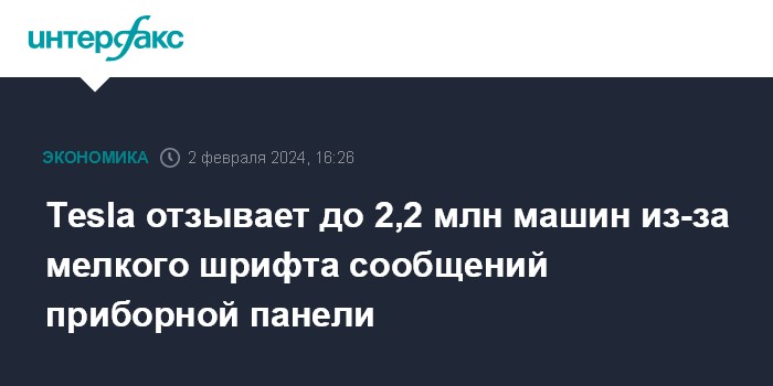 Москва. 2 февраля. INTERFAX.RU - Американская Tesla отзывает до 2,2 млн электромобилей, включая выпущенные в этом году пикапы Cybertruck, в связи с неправильным размером шрифта предупреждающих сообщений на приборной панели, отмечается на сайте Национального управления по безопасности дорожного движения США (National Highway Transportation Safety Administration, NHTSA).